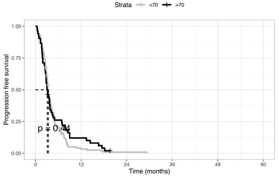 Regarding the antitumor activity of second-line chemotherapy, the disease control rate was 28.8% (n = 15) and 29.7% (n = 41) in elderly and younger patients, respectively. This was mainly achieved through disease stabilization (n = 12, 23.1%, and n = 36, 26.1%, respectively), while objective responses were uncommon, with partial responses observed in three (5.7%) and five (3.6%) patients, respectively. Instead, no complete responses were recorded. As concerns the impact of second-line treatment on survival outcomes, no statistically significant differences between the two age groups were seen in both median OS (5.7 months in the elderly versus 6.1 months in younger patients, HR 0.97; p = 0.86) (Figure 1) and median PFS (4.7 vs. 4.8 months, HR 0.88; p = 0.44) (Figure 2).