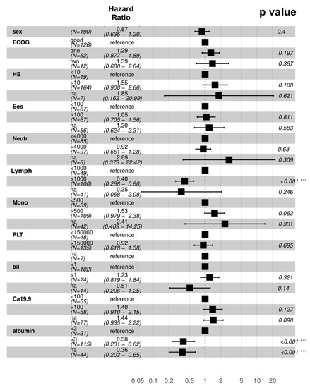 Univariate analysis of overall survival. Abbreviations: Bil—total bilirubin; Eos—eosinophil count; HB—hemoglobin; Lymph—lymphocyte count; Mon—monocyte count; Neutr—neutrophil count; PLT—platelet count. *** statistically significant results.