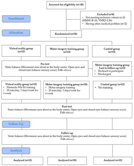 MIT refers to internally perceiving motor imagery (MI) that imagines motions without physical movements and simulates them mentally []. Just by performing MIT, a reaction similar to that of the active area of the brain that activates during physical training can be obtained, resulting in similar benefits to physical training []. Furthermore, the greatest advantages of MIT are that it is not costly and improves performance by providing individuals with arousal and concentration strengthening []. Regardless of age, older adults are as effective as young adults in forming MI []. Therefore, MIT can be an alternative to improve the balance ability of older adults and prevent a decrease in physical activity [].