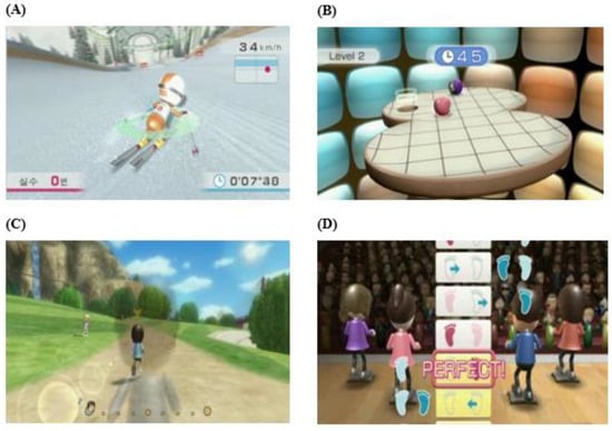 Virtual reality exercise program. (A) Balance ski; (B) Table tile; (C) Jogging; (D) Rhythm step.