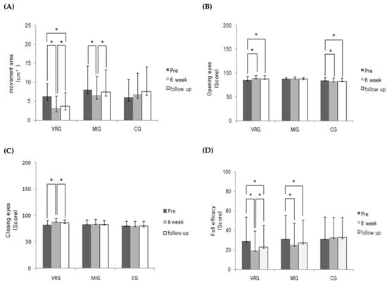 Comparison of each group according to the period. (A) Body center movement area; (B) Balance sensory with eyes kept open; (C) Balance sensory with eyes kept closed; (D) Falls efficacy score. * p < 0.05.