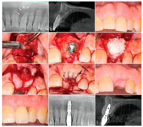Clinical and radiological findings of case #1. (a) Pre-operative panoramic radiograph showing severe bone resorption and periapical radiolucency around the root of #21 (white arrow). (b) Cross-sectional image of CBCT #21 showing ICT around #21. (c) Pre-operative photograph #21. (d) Flap extension by dissection of the ICT attached to the buccal flap with the base attached to the existing flap using a #15 blade. (e) Implant #21 placement with peri-implant osseous defect. (f) Bone graft placement over implant. (g) Resorbable collagen membrane placement and extended IGT sutured to the palatal flap with resorbable sutures. (h) Primary closure with extended IGT. (i) Post-operative photograph showing no flap exposure. (j) Final prosthesis #21. (k) Panoramic radiograph taken 12 months after prosthesis delivery. (l) Cross-sectional image of CBCT taken 12 months after prosthesis delivery with sufficient bone regenerated around the implant.