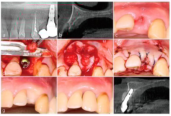 Compared to extraction sockets of uncompromised teeth, compromised extraction sockets have larger bone defects and more granulation and inflammatory tissues. Kim et al. [] stated that it is important to completely remove the infection source during ridge preservation in a compromised extraction socket. Ridge augmentation after sufficient soft tissue healing or delayed implant placement after ridge preservation are common techniques that can be applied in cases of compromised sockets [,,,]. However, natural, non-intervened healing after extraction of periodontally compromised teeth leads to severe loss of both soft and hard tissues. According to a systematic review by Tan et al. [], after tooth extraction, there is rapid loss of alveolar bone in the first 3–6 months and gradual reduction thereafter. Therefore, delayed implant placement performed after healing may require a large amount of GBR. Esthetic problems may also occur after surgery with soft and hard tissue deficiencies especially in the esthetic area. In this respect, the treatment combining immediate implant placement and simultaneous GBR can have many advantages.