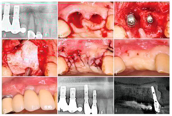 - Eskan, M.A.; Girouard, M.E.; Morton, D.; Greenwell, H. The effect of membrane exposure on lateral ridge augmentation: A case-controlled study. Int. J. Implant Dent. 2017, 3, 26. [Google Scholar] [CrossRef]