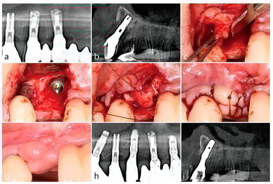 Clinical and radiological findings of case #4. (a) Pre-operative panoramic radiograph showing severe bone resorption and periapical radiolucency around the existing implant #13. (b) Cross-sectional image of CBCT #13 showing ICT. (c) Flap extension by dissection of the ICT attached to the buccal flap with the base attached to the existing flap using a #15 blade. (d) Implant #13 placement with peri-implant osseous defect. (e) Bone graft and resorbable collagen membrane placement over implant. Extended IGT sutured to palatal flap. (f) Flap closure with extended IGT. (g) Post-operative photograph showing healing with no flap exposure. (h) Panoramic radiograph taken 28 months after prosthesis delivery. (i) Cross-sectional image of CBCT taken 28 months after prosthesis delivery with sufficient bone regenerated around the implant.