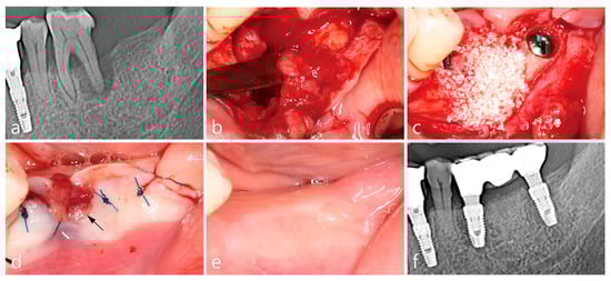 Clinical and radiological findings of case #5. (a) Pre-operative panoramic radiograph showing severe bone resorption around #36. (b) Flap extension by dissection of the ICT attached to the buccal flap with the base attached to the existing flap. (c) Bone graft placement over #36 implant. (d) Flap closure with extended IGT. (e) Post-operative photograph showing healing with no flap exposure. (f) Panoramic radiograph taken 19 months after prosthesis delivery.