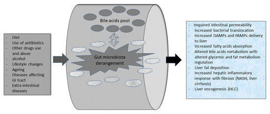 Gut microbiota can be defined as a complex ecosystem encompassing more than 100 trillion microbes belonging to bacteria, viruses, archaea, protozoa, fungi, and yeasts living in our intestines. However, this taxonomic definition does not describe its functioning, which strictly relies on qualitative and quantitative composition [1]. When the qualitative and quantitative composition of gut microbiota remains stable we can speak about “eubiosis” [1]. When this composition is altered by intestinal and environmental factors (e.g., use of antibiotics, or gastrointestinal and extraintestinal infections), “dysbiosis” is established [2]. There are different dysbioses for different gastrointestinal and extra-intestinal diseases [3,4]. Thus, this significant association is gaining more and more attention from researchers as it can help the development of “personalized” medicine [5]. Non-alcoholic fatty liver disease (NAFLD) is a complex condition characterized by fat deposits within hepatocytes [6]. Liver fat deposition is significantly associated with obesity, dyslipidemia, type 2 diabetes, and insulin resistance as comorbidities [7,8]. Almost one-quarter of the Westernized population is affected by this condition which has a spectrum of stages [9]. Aside from fat deposition, about 10–15% of patients can develop liver fibrosis because of progressive liver inflammation [10]. Liver fibrosis characterizes non-alcoholic steatohepatitis (NASH). If liver fibrosis is not reverted and/or stopped by treatments and lifestyle changes, patients can develop liver cirrhosis as well [11]. Particularly, NAFLD patients can show hepatocellular carcinoma (HCC) also without liver cirrhosis at any stage [12]. In NAFLD, gut microbiota derangement, namely dysbiosis, is resembled by an increased abundance of Bacteroidetes and a decrease of those of Firmicutes [13]. This starts a pathophysiological process through the “gut-liver axis “ where antigens from intestinal pathogens enter the portal blood cycle via a deranged intestinal permeability through damage-associated molecular patterns (DAMPS) and pathogen-associated molecular patterns (PAMPS) [14]. This pathophysiological cascade leads the liver to be exposed to detrimental antigens that start and perpetuate liver damage [14]. Conversely, liver inflammation favors altered intestinal permeability increase [14]. Bile acids (BA) are involved in lipid absorption and metabolism regulation [15]. Gut microbiota is also implicated in such regulation and actively interacts with the free BAs pool and their receptors, particularly the farnesoid X receptor (FXR), present both in enterocytes and hepatocytes, with different and tissue-specific effects on liver fat deposition and fibrosis [16]. The use of antibiotics, pre-, and probiotics to restore gut “eubiosis” in NAFLD patients has shown limitations as well as promising results. Probiotics can protect the liver from toxic substances driven to the liver by altered intestinal permeability. In addition, they can restore altered intestinal permeability, and gut eubiosis and exert a direct anti-inflammatory effect on gut and liver tissue. Antibiotics can restore gut eubiosis and prevent the pathophysiologic cascade characteristic of the “gut-liver axis”. Unfortunately, probiotics efficacy needs larger randomized clincal trials (RCT)s investigating their safety. Antibiotics suffer from the emerging issue of antibiotic resistance development within the gut, with potential deleterious side effects for the whole human body [17]. Direct fecal microbiota transplantation (FMT) is a safe and very successful treatment for GI infections such as those by Clostridium difficile and other Clostridiales [18]. In particular, Clostridium difficile infection (CDI) is a worldwide healthcare problem as it is associated with severe diarrhea until toxic megacolon occurrence. CDI is typically associated with the use of antibiotics, and recurrent CDI (rCDI) has significant mortality. FMT has been seen to confer a high success rate in the treatment of CDI and rCDI as it restores the commensal gut microbiota and re-establish “indirect mechanisms“ of colonization resistance. Indeed, FMT restores microbiome-mediated regulation of the integrity of the gut barrier function to prevent penetration/translocation of potential pathogens (namely, Clostridiales). Several preclinical and some clinical evidence support the use of FMT also in NAFLD patients [19]. However, the role of FMT as a therapeutic choice in NAFLD has not been fully elucidated. Thus, we first review the literature on gut microbiota physiologic composition, the concepts of “dysbiosis” and “eubiosis”, and their role in the pathogenesis and pathophysiology of NAFLD. Finally, we reviewed the data on FMT use in preclinical and initial human studies.
