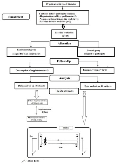 Twenty patients with type 2 diabetes (age (years): 55.4 ± 1.2; height (m): 1.7 ± 0.01; body composition (kg); 68.3 ± 1.7)) volunteered to participate in this study after the exclusion of nine participants because they did not meet the inclusion criteria. After receiving a detailed explanation of the protocol, they gave written consent to participate in the study. The participants were also selected based on their chronotype and their answers to the self-assessment questionnaire of Horne and Ostberg [16]. They had an intermediate chronotype (i.e., sleep duration between 23:00 h ± 1:00 h and 07:00 h ± 1:00 h). The exclusion criteria included people with known health problems such as hypertension or heart, kidney, or liver problems. In addition, people who regularly took medications or hypoglycemic drugs, including dietary supplements or vitamins, were not eligible for the study. The study protocol was in line with the Helsinki Declaration for human experimentation and was approved by the University Ethics Committee of Tunisia.