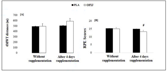6MWT [A] and RPE scores [B] (mean ± SD) without and with supplementation of PLA and OFIJ. ¥: significant difference compared with PLA (p < 0.05).