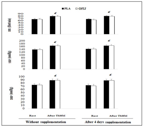 The post hoc analysis showed that HR, DBP, and SBP (Figure 3) recorded following the 6MWT were significantly higher than those recorded at rest in OFIJ and PLA without (+16.30% and +16.58% for HR, +16.70% and +16.34% for SBP, and +16.68% and +16.04% for DBP, respectively; p < 0.05) and with supplementation (+19.92% and +16.60% for CF, +14.15% and +14.07% for SBP, and +18.54% and +17.93% for DBP, respectively; p < 0.05).