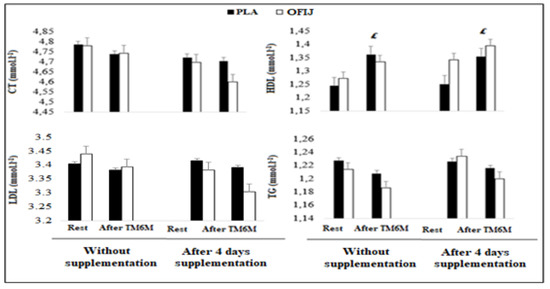 Lipid-profile parameters (mean ± SD; n = 20) recorded before and after the 6MWT during without and with supplementation of PLA and OFIJ. £: significant difference compared to before the 6MWT (p < 0.05).