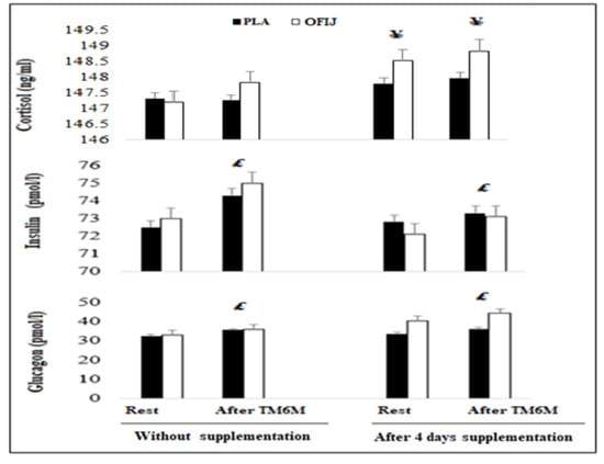 Hormonal parameters (mean ± SD; n = 20) recorded before and after the 6MWT during without and with supplementation of PLA and OFIJ. £: significant difference compared to before the 6MWT (p < 0.05). ¥: significant difference compared to without supplementation (p < 0.05).