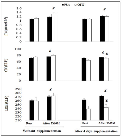 Muscle-damage markers (mean ± SD; n = 20) recorded before and after the 6MWT during without and with supplementation of PLA and OFIJ. £: significant difference compared to before the 6MWT (p < 0.05). ¥: significant difference compared to without supplementation (p < 0.05).