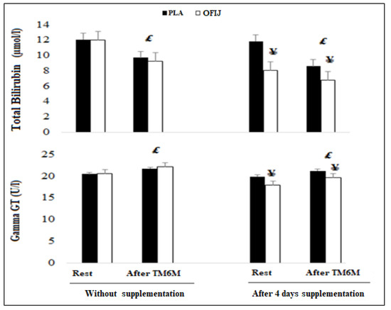 Hepatic parameters (mean ± SD; n = 20) recorded before and after the 6MWT during without and with supplementation of PLA and OFIJ. £: significant difference compared to before the 6MWT (p < 0.05). ¥: significant difference compared to without supplementation (p < 0.05).