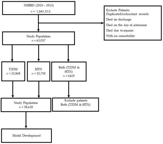 Patients with both T2DM and HTN were identified by querying the above two datasets. Finally, we selected patients with either T2DM or HTN as primary comorbidities for predicting LoS and mortality. We also excluded patients with duplicate records, patients who died on discharge, those with missing/incomplete data, patients who died on the day of admission, and deaths due to injuries or suicide. Demographic characteristics of all patients with T2DM, HTN, and both HTN and T2DM has been explained in the results. However, we continued to develop the prediction model by previously excluding patients who had both T2DM and HTN (see Figure 1).