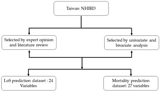 In our study, we selected predictors based on literature review, expert opinion, and univariate and bivariate analysis []. First, we identified features through expert opinions and a literature review. Thereafter, we conducted univariate and bivariate analyses on the feature set using chi-square. Subsequently, 24 features were selected for the LoS prediction, and 27 features were considered for the mortality prediction (see Figure 2).