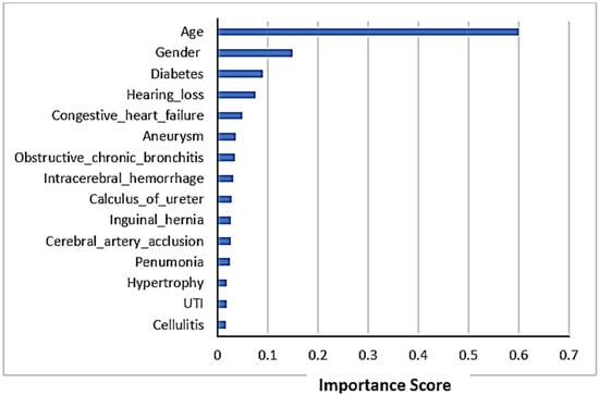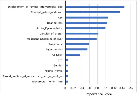 The top 15 features’ importance scores in mortality prediction are shown in Figure 4. We selected all the features to predict mortality. The figure shows that the displacement of a lumbar intervertebral disc was the most important feature in mortality prediction using Random Forest Classifier. This comorbidity could be the major factor affecting mortality. The other most important features influencing mortality prediction were cerebral artery occlusion and age.