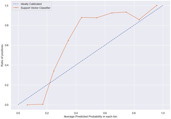 SVC line without calibration vs. after calibration (Ideal fit is represented as blue line).