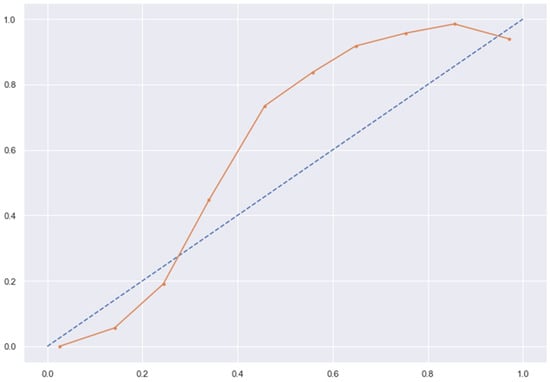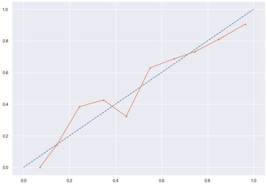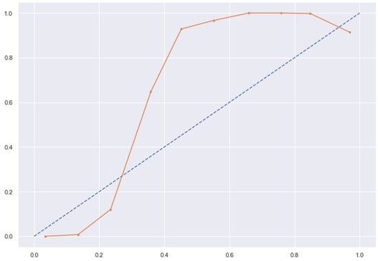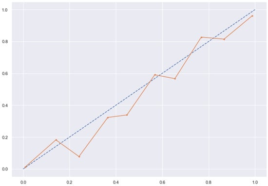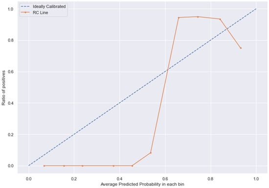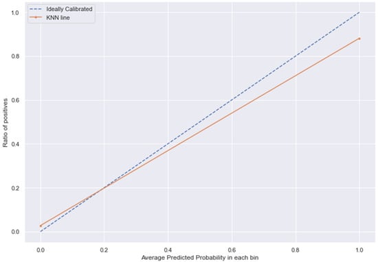 KNN line without calibration vs. after calibration (Ideal fit is represented as blue line). Note: All other models (RFC, GBC, BC) were overfitting the data and had a balanced accuracy score of 1.