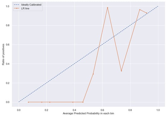 LR line without calibration vs. after calibration (Ideal fit is represented as blue line).