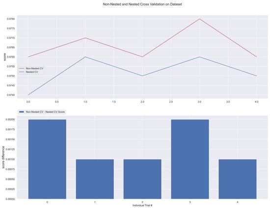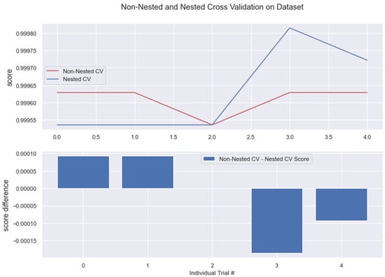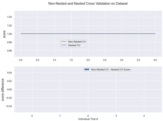 The results from nested and non-nested cross-validation on the training dataset are compared in the figures below (see Figure 17, Figure 18, Figure 19, Figure 20 and Figure 21). We conducted five trials and compared the nested and non-nested cross-validation scores as well as the average difference in scores from each experiment. The x-axis and y-axis represented the individual trial # (# depicts number) and score, respectively. This was then applied to all the algorithms. We observed that the average difference between trials was noticeably small, i.e., the difference between nested and non-nested cross-validation scores was not much.
