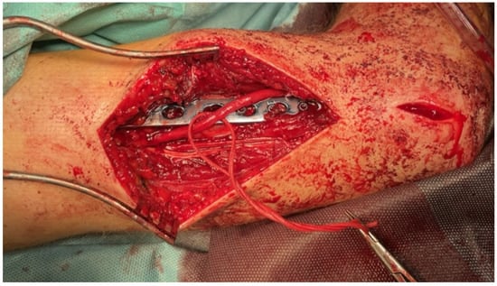 Patient No. 6. Intraoperative picture after nerve exploration and open reduction with internal fixation (ORIF). Intraoperative electrostimulation confirmed the preserved radial nerve continuity.