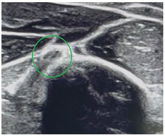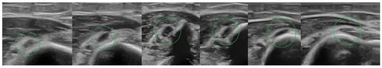 US examination is helpful because it can detect nerve transection, nerve damage at the level of the hypoechogenic bone callus or nerve entrapment between bone fragments. It is non-invasive and accessible, but it requires a lot of experience from the examiner [,]. US is practically not applicable at the early stage after the fracture in connection with pathological humerus mobility and severe pain, especially in young and uncooperative children. Based on standards dedicated to adults proposed by Y.C. Shao et al., an US is recommended up to three weeks after the injury []. USs were performed in our study on two patients (No. 3, No. 6) and it helped both to establish the indications for the surgical nerve exploration. Our experience has shown that it is difficult to assess the longitudinal course of the nerve at the fracture level, which requires a lot of experience from the physician as well as patience from the patient. In our opinion, it is much easier to trace the radial nerve course in transverse US sections, and in the case of any abnormalities, complete the assessment of longitudinal sections. It needs to be highlighted that the radial nerve changed its shape from round at the proximal third of the humerus to oval at the middle third on the transverse US scan []. Ultrasound scans of the correct transverse section of the radial nerve are shown in Figure 3. In Figure 4, subsequent ultrasound scans of transverse radial nerve sections are shown (abnormal hypoechogenic nature of the radial nerve found at the level of stretching between the bone fragments). In our opinion, USs play a crucial role in the system of decision making.