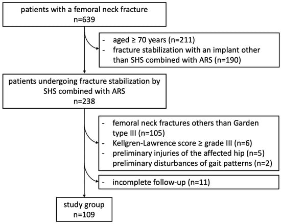 - Yang, J.-J.; Lin, L.-C.; Chao, K.-H.; Chuang, S.-Y.; Wu, C.-C.; Yeh, T.-T.; Lian, Y.-T. Risk factors for nonunion in patients with intracapsular femoral neck fractures treated with three cannulated screws placed in either a triangle or an inverted triangle configuration. J. Bone Jt. Surg. Am. 2013, 95, 61–69. [Google Scholar] [CrossRef]