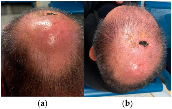 The vertical extramedullary tumor with necrotic appearance and the parietooccipital erythematous lesion of the patient with granulocytic sarcoma. (a) The back view shows erythematous swelling; (b) The view from the top; dried exudate and necrotic ulcer-like appearance of the sarcoma.