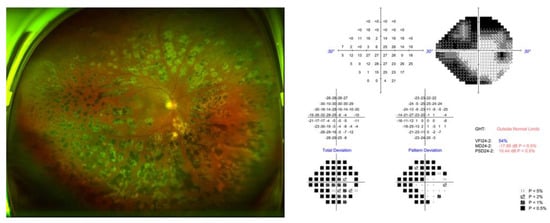 Preoperative ultra-wide-field fundus photograph and visual field. (GHT, glaucoma hemifield test; MD, mean deviation; PSD, pattern standard deviation).
