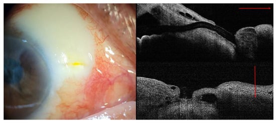 In addition to pre-existing risk factors that might contribute to the formation of avascular thin blebs, mechanical stress could have aggravated conjunctival injury due to foreign-body sensation in this elderly patient [] with degenerative conjunctival changes, such as Meibomian gland dysfunction, decreased tear film volume, tear film instability, and coexisting ocular disease with diabetes and hypertension. Based on AS-OCT examination, we hypothesized that all these mechanisms might induce XEN gel stent exposure with conjunctival erosion. Similarly, Arnould et al. suggested that morphological changes in OCT after XEN gel stent implantation may help guide bleb revision and the management of conjunctival erosion and device extrusion []. In our case, AS-OCT examination demonstrated XEN gel stent exposure without conjunctival coverage and surgical results. In this context, the proper use of AS-OCT for evaluating and monitoring bleb morphology could provide additional information regarding XEN gel stent positioning, bleb morphology, and the status of the conjunctiva or Tenon’s capsule.