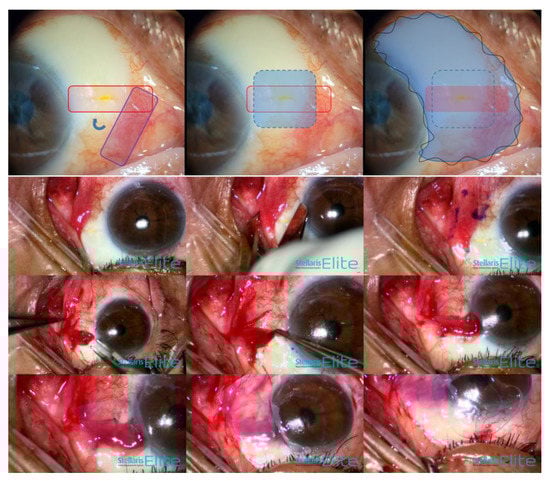 Various conservative treatment options, such as pressure patching, contact lenses, topical lubricants, autoserums, and ointments, have been considered to resolve these problems [,,,]. However, in our patient, conservative treatment was unsuccessful. Therefore, we decided to perform surgical bleb revision. Arnould et al. [] reported excision of a scarred bleb, free conjunctival graft, XEN gel stent trimming by 1.5 mm and complementary amniotic graft. Kingston et al. reported removal of the XEN gel stent, Tutoplast plugging into the scleral opening, amniotic membrane graft over the ischemic scleral bed, and fixation to healthy conjunctival and limbal tissues. [] Another study reported ab interno repositioning of the stent through the anterior chamber and direct suturing of the conjunctival defect [].