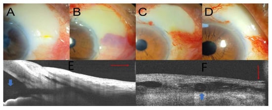 Preoperative anterior segment photography (A) and postoperative photographs on day 10 and at 1 month and 3 months (B–D). AS-OCT (E,F) demonstrated the well-covered conjunctiva over the XEN gel stent postoperatively after 1 month (blue arrow: XEN gel stent implant; red line: linear scan line on AS-OCT).