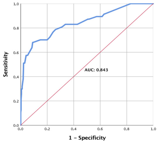ROC (receiver operating characteristic) for predicting urogenital injuries in polytrauma patients. The ROC (receiver operating characteristic) for use of the above scoring system in predicting urogenital injuries in polytrauma patients, the AUC (area under the curve) is 0.843.