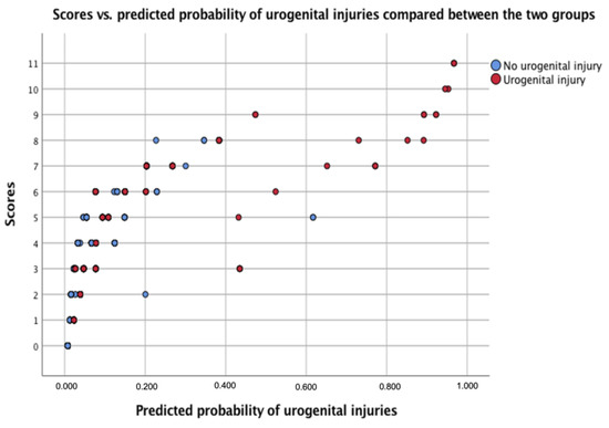 Assessment of the proposed UPPS score. Scatter blot demonstrating UPPS score vs. predicted probability of urogenital injuries, compared between patient groups with and without urogenital injuries.