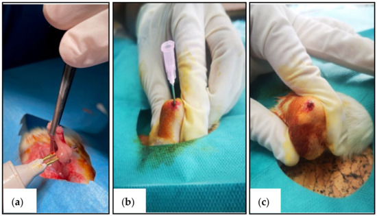 Intraoperative images: (a) Ovariectomy procedure; (b) Opening of the femoral canal; (c) Implantation of the titanium intramedullary nail.