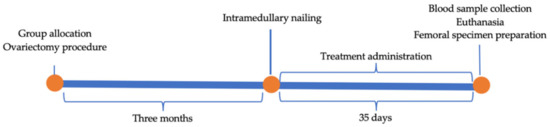 Project’s timeline: group allocation, ovariectomy procedures, intramedullary nailing, treatment administration, blood sample collection, euthanasia, and femoral specimen preparation.