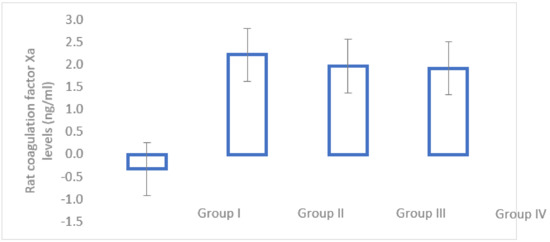 The rat coagulation factor Xa was calculated in all of the subjects at the end of the study (n = 61), as follows: 17 subjects in Group I, 15 subjects in Group II, 16 subjects in Group III and 13 subjects in Group IV. The results are available in Figure 3. Group I had statistically significantly lower levels than Groups II, III and IV (p < 0.001). There were no statistically significant differences between Groups II, III and IV.