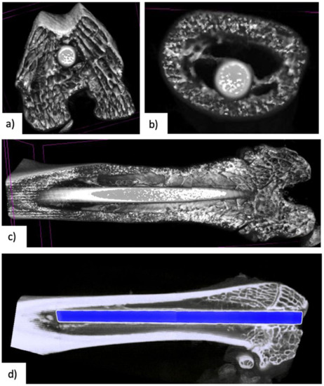 Images obtained following micro-CT examinations: (a) cross-sectional view of the intramedullary nail at the distal epiphysis; (b) cross-sectional view of the intramedullary nail at the middle of the femoral diaphysis; (c) longitudinal view of the intramedullary nail; (d) longitudinal view of the intramedullary nail with automatic detection of the metal implant by the software.