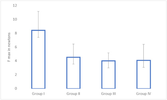 The mechanical pull-out test was performed in all of the subjects (n = 61). The average values of the maximum force needed to extract the intramedullary nail are available in Figure 5. The control group had the highest average force needed for intramedullary nail extraction, followed by enoxaparin. There were statistically significant differences between Group I and Group III (p = 0.01), Group I and Group IV (p = 0.03), as well as between Group I and Group II (p = 0.04). There were no statistically significant differences between the treatment groups.