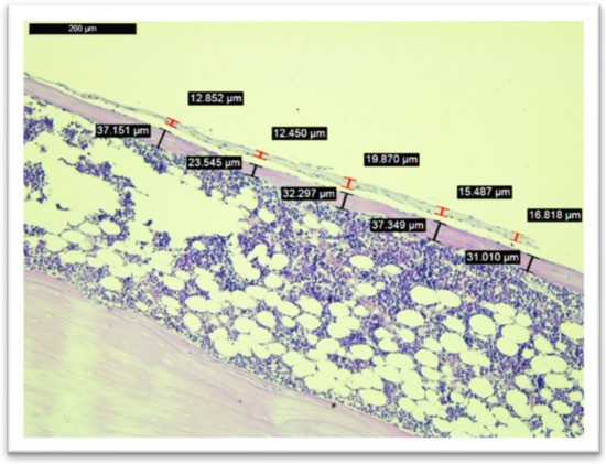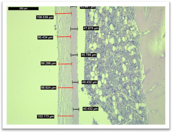 Histological analysis was performed on all of the subjects within the study (n = 60), except for one subject in Group IV whom we excluded after SEM/EDX analysis due to higher concentrations of calcium and phosphorus on the implant after its removal. Images from the measurements of the fibrous tissue and bone tissue are seen in Figure 6 and Figure 7.