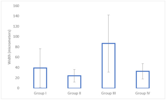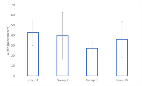 In terms of cortical bone surrounding the implant site, the nadroparin group had the lowest width (see Figure 8). The only statistically significant result was obtained between Group I and Group III (p = 0.0002).