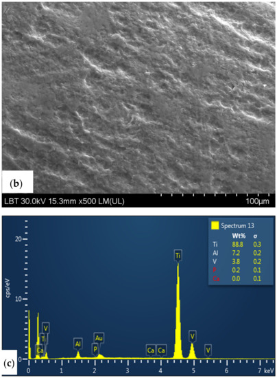 Moreover, the EDX analysis of the titanium, aluminium, and vanadium showed an average concentration of 88.6%, 7.3%, and 3.8%, respectively. The images obtained from the SEM/EDX analysis are available in Figure 10.