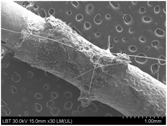 We also performed the SEM/EDX analysis to determine whether bone tissue was still present on the implant surface after its extraction from the femoral bone during the pull-out test. The EDX analysis only showed small concentrations of calcium and phosphorus in all of the implants, except in one case, where there was a high concentration of calcium and phosphorus and was later excluded from the histological examination. These results show that most implants did not contain relevant concentrations of calcium or phosphorus following implant removal.