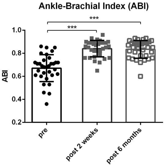 In the two-week checkup, the mean ABI significantly increased from 0.67 ± 0.12 (SD) to 0.84 ± 0.07 (SD) (p < 0.0001). After six months post-intervention, no further change could be observed (mean 0.83 ± 0.08 (SD)) (p < 0.0001 compared to baseline) (Figure 1).
