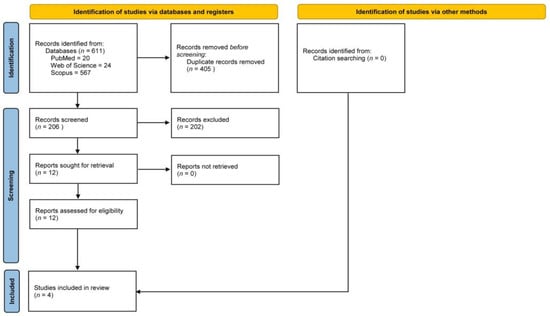 The electronic initial search of the databases yielded 611 articles. In total, 405 duplicate articles were removed. The remaining 206 articles were screened using titles and abstracts. In vitro studies, studies evaluating the efficacy of antibiotics other than systemic amoxicillin–metronidazole, non-randomized controlled trials, case reports and series, and studies evaluating other adjuvants to NSPT, including laser and photodynamic therapy were excluded. The full texts of twelve articles were selected for further review. Based on the predefined eligibility criteria, eight articles were excluded. Two of the articles excluded repeated trial data and were longer-term follow-ups [,]. Four articles were selected for inclusion in this review. Figure 1 depicts the PRISMA flow diagram.