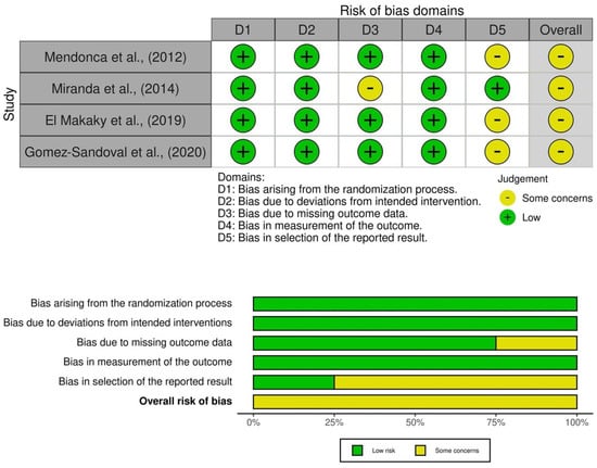 Based on ROB2, all included trials presented some concerns based on methodological insufficiencies [,,,]. These were mainly related to dropouts resulting in missing outcome data and concerns regarding selective reporting. Figure 2 provides a summary of the risk of bias [].