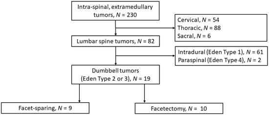 All spinal dumbbell tumors, Eden type 2 and 3, operated at the neurosurgical department, University Hospital Münster between 2014 and 2021, were included [1,2]. The groups of facet-sparing and facetectomy approaches were formed according to individual surgeons’ preferences. See Figure 1 for a study flow diagram.