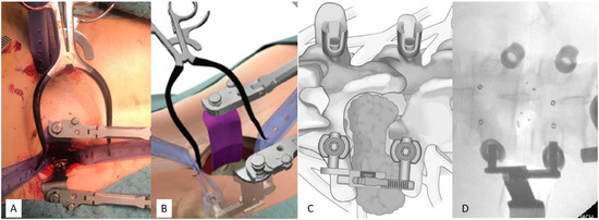 Patients in the facetectomy cohort were operated as described previously [8]. Briefly, carbon fiber-reinforced polyether ether ketone (CFR-PEEK; VADER; icotec AG, Altstätten, Switzerland) pedicle screws were inserted percutaneously. Afterwards, on the side of the tumor, the two pedicle screw incisions were joined. Subsequently, a transmuscular retraction device (Terra Nova; Stryker, Kalamazoo, MI, USA) was connected to the screws to prepare the surgical field for posterolateral facetectomy and laminotomy, followed by microsurgical tumor resection (see Figure 2). In Eden type 2 lesions, the intradural part of the tumor was resected via durotomy, which was closed subsequently with a continuous suture and TachoSil® (Takeda, Tokyo, Japan) sealing. Discectomy and cage (icotec AG) insertion via trans-foraminal approach was performed if the index level was below L 2/3. Autologous bone and artificial bone adjuvant (Cerasorb foam; Curasan AG, Kleinostheim, Germany) were applied unilaterally to bridge the facetectomy gap. Finally, CFR-PEEK rods (BlackArmor; icotec AG) were inserted and fixed to the pedicle screws. In this group, early postoperative 1.5-T magnetic resonance imaging (MRI) was performed within 48 h after surgery to check implant placement and to serve as a basis for further imaging.
