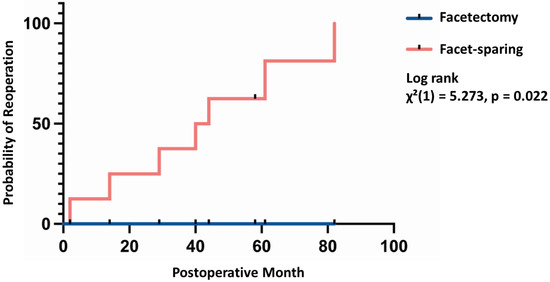During further median follow-up time (51 months IQR: 21–75), all patients with residual tumor (N = 8, 88.9%, p < 0.001) showed radiographic signs of tumor progression and underwent a second resection after a median follow up time of 42 months (IQR 25–66). In comparison, all patients with GTR—in both groups—are still tumor free after a median follow up time of 24 months (IQR 14–40) (see Table 2). Kaplan–Meier statistics revealed a significantly shorter time to progression for the facets-sparing cohort χ²(1) = 5.273, p = 0.022; Figure 3).